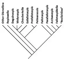 Repinaella is closest to the common ancestor with the other Olenellina. Second to split away is the Daguinaspididae-family, which comprises the closely knit group of Choubertella, Daguinaspis and Wolynaspis, with Eofallotaspis slightly further removed, and near the basis a subgroup consisting of Profallotaspis and Pelmanaspis. The monotypical family Fallotaspididae is next to branch-off. This is followed by the branch of Parafallotaspis all on its own, followed by the monotypical family Archaeaspididae. Finally Fallotaspidella is closest to the trilobites with dorsal cephalic sutures, such as Bigotina and Lemdadella.[1]