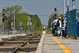 | Platforms | 1 side platform and 1 island platform (low-level) | ||||||||||