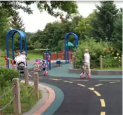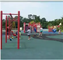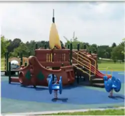 In 1999, Hadley’s Park opened with a castle, a frontier village and a pirate ship. Rather than using gravel or woodchips, Hadley’s Park had a rubber-based surface covering thirty-four thousand square feet (34000 ft^2) of playing surface.[5] This is one of the largest pour-in-place playing surfaces in the world.[5] The surface is durable enough for wheelchairs and walkers, yet soft enough to not hurt a child if they fall. The incorporation of high edge curbs, bright colors and Braille signage supports visually-impaired children.[5]