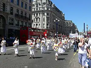 In contrast to marches, which focus on bringing attention to the persecution in China, celebratory Falun Gong parades usually incorporate traditional-style Chinese dances, costumes, song, exercise demonstrations, drumming, floats, and banners.[52] Practitioners regularly hold parades or public exhibitions of Chinese cultural performances to coincide with May 13, the anniversary of the practice's first public teaching in China. Practitioners also utilize various parade venues around the world to publicize their group and its message.[28]