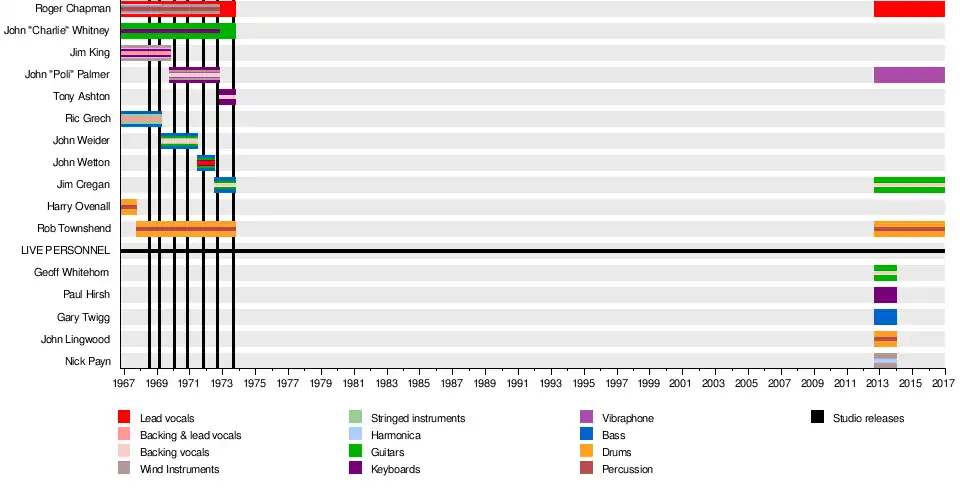 - Roger Chapman – vocals, harmonica, saxophones, percussion (1966–1973, 2013–2016)