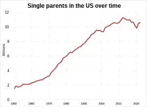 The percentage of single-parent households has doubled in the last three decades, but that percentage tripled between 1900 and 1950.[9] The sense of marriage as a "permanent" institution has been weakened, allowing individuals to consider leaving marriages more readily than they may have in the past.[10] Increasingly, single-parent families are due to out of wedlock births, especially those due to unintended pregnancy. From 1960 to 2016, the percentage of U.S. children under 18 living with one parent increased from 9 percent (8 percent with mothers, 1 percent with fathers) to 27 percent (23 percent with mothers, 4 percent with fathers).[7]