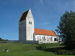 Fanefjord Church (Fanefjord kirke) is on the Danish island of Møn. It is located in an open setting overlooking the Baltic Sea inlet of Fanefjord between Store Damme and Hårbølle. Standing on the top of a small hill, the church's red-tiled roof and whitewashed walls can be seen from considerable distances, whatever the direction. The interior is of particular historical interest, in view of the many frescos dating back to the 13th and 16th centuries and Fanefjord Church is considered the most famous attraction on Møn.[1]