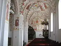 The earliest frescos, on the triumphal arch, were painted around 1350. They depict the four evangelists, as well as St Christopher and St George. The most famous frescos are however those dating back to about 1500 which cover large areas of the church's ceiling and upper walls. In the so-called Biblia pauperum style, they present many of the most popular stories from the Old and New Testaments.