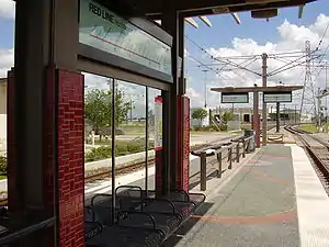 The single island platform, includes two shelters are located on the platform covering small seating areas, featuring custom made ceramic panels created by artist Jonathan Brown.[1] In having 1,437 spaces, this station is the only one along the Red Line with a designated parking facility operated by METRO (although others are located near private lots garages).[2] The trip to the UH–Downtown station at the northern terminus takes 30 minutes with trains operating a six-minute intervals during weekdays, at twelve-minute intervals during the evenings and at twenty-minute intervals at night.[3]