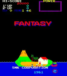 Fantasy is an action game developed by SNK and released for arcades in October 1981. It was licensed to Rock-Ola[2] for North American release in February 1982. The game is controlled with a single joystick.[3] One level plays the melody from the song "Funkytown".[4] According to the book Gamers: Writers, Artists & Programmers on the Pleasures of Pixels, this is the first arcade video game to have a continue feature.[5]