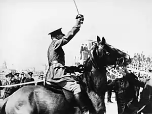 The New Guard saw the Premier of New South Wales Jack Lang as an immediate threat. The organisation attracted attention when member Francis de Groot, on horseback and at Campbell's direction, upstaged Lang in cutting the ribbon at the opening ceremony of the Sydney Harbour Bridge in protest at Lang's anti-monarchist sentiments.[9][10]