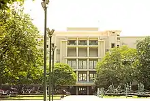 Dr. Nicanor Reyes Sr., as the founding president of the University, spent his early years establishing several of its institutes, including those of Law and Technology. Dr. Reyes Sr. commissioned Architect Pablo S. Antonio Sr. to construct the main building for the University.[19] In 1939, the Nicanor B. Reyes Sr. Hall, which would later house the main library at third level and Institute of Accounts, Business and Finance, opened. Two other buildings by Antonio, the Girls’ High School Building and Boys High School Building, followed in 1940 and 1941,[19] by which year FEU had approximately 10,000 registered students, with an international student population of 400.[20][17] Former Philippine President Manuel L. Quezon hailed and called FEU "the best non-sectarian institution in the country."[21]