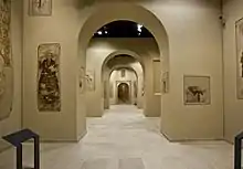 Room VI is designed to evoke the character of a temple, with arcades forming subsequent annexes in which the wall paintings are presented. The spatial arrangement is similar to that of the Faras Cathedral. The arcades are complemented by an apse. This room contains wall paintings removed from the walls of the nartex, northern nave and presbytery. The paintings have been created between the 7th and 14th centuries and were found on various layers of plaster (due to multiple stages of building of the cathedral and covering the walls with newer images). The wall paintings are images of Christ, Mary, angels and archangels, saints, bishops and rulers. They are painted al secco.[7]