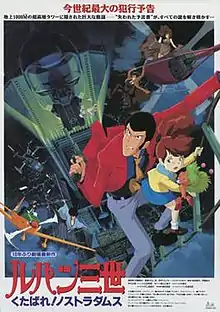 Lupin III: Farewell to Nostradamus (Japanese: ルパン三世 くたばれ!ノストラダムス, Hepburn: Rupan Sansei: Kutabare! Nosutoradamusu, lit. "Lupin III: Die! Nostradamus"), sometimes also referred to as To Hell With Nostradamus, is a 1995 Japanese animated film. It is the fourth theatrical feature film in the Lupin III franchise, and the first time Lupin's voice is provided by Kanichi Kurita, following the death of Yasuo Yamada; a tribute to him appears after the credits in the original Japanese release. The North American release was done by Funimation; it was released individually and later made a part of the "Final Haul" box set. For reasons unknown Funimation cut the tribute to Yasuo Yamada out of their release.