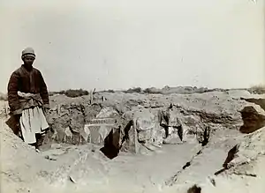 Sir Marc Aurel Stein, a Hungarian-born early British archaeologists and explorer, investigated the remains of numerous centers of Buddhism during the early 1900s through three expeditions to the Silk Road. One of the sites Stein uncovered was the Buddhist shrines at Farhad-beg-yailaki, dated to around the fourth to sixth century AD.[2]