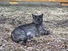 The farm cat, also known as a barn cat, is a domestic cat, usually of mixed breed, that lives primarily outdoors, in a feral or semi-feral condition on agricultural properties, usually sheltering in outbuildings. They eat assorted vermin such as rodents and other small animals that live in or around outbuildings and farm fields. The need for the farm cat may have been the original reason cats were domesticated, to keep rodents from consuming or contaminating grain crops stored for later human consumption. They are still commonly kept for their effectiveness at controlling undesired vermin[1][2][3][4][5][6] found on farms, ranches, greenhouses, and even drug farms, which would otherwise eat or contaminate crops, especially grain or feed stocks. Farm cats hunt the initial rodent population, and their pheromones keep further rodents from filling the void.[7][8]