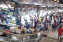 The market has a total floor area of 12,000 m2 (130,000 sq ft) and is occupied by over 50 tenants.[4] The market features a variety of local shops that primarily sells fresh products, ranging from fishes, meat, and fruits and vegetables, and also features the Fishmoko section a fish market highlighting live fish stored in freshwater tanks, and the Dampa sa Farmers Market (Dampa at the Farmers Market), a food court offering fresh foods and freshly cooked meals from the market stalls. The market is also occupied by various merchandise shops, a barbershop, a hair salon, bakeries; and fast-food chains, such as Jollibee, McDonald's, Chowking, Tokyo Tokyo, Tapa King, and King Sisig; and Mercury Drug.[5]