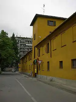The farm Guzzina, in the south area of Brugherio and opposite the district Edilnord and bordering Cologno Monzese, once stood isolated in the rural town of Moncucco.[4] Its name comes from gussetta, referret to failed cocoons, testimony of the wide spread of sericulture in these places. In addition to the breeding of silkworms, the farm was known since the eighteenth century for the production of wine.[9] The Guzzina is a complex of buildings that includes, within the town walls plastered with intense yellow, some agricultural courts, a villa owned by Count Venino and a private chapel dedicated to St. Andrew at the beginning, then to Santa Maria degli Angeli and finally to the Magi. Both the villa and the church date back to 1500.[3][9]