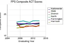 Michigan provides data on the historical ACT testing performance for the district, as well as the individual high schools.[5] Scores from North Farmington and Farmington compare favorably against the national ACT composite average, and scores from Harrison compare roughly to the composite average for the state. The full data set appears below: