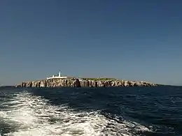 All the operational lighthouses on the Farnes are now automatic and have no resident keepers, although in former years, they did. The lighthouse is now maintained by Trinity House via its local lighthouse attendant, George Shiel, who provides guided tours inside the lighthouse.[10] Ruins of some of the older lighthouses may be seen, for example on the Brownsman, which has two. Before the lighthouses, beacons were on several of the islands. The prominent white streak on the cliff facing the mainland (see photo) is similar to bird droppings; although many parts of the islands do exhibit this colouring during the breeding season only, in this case it is the result of chalk deposits from the many years of spent calcium carbide from the lighthouse being thrown down the cliff; this calcium carbide was used to generate acetylene, which was used as fuel for the light before electricity came.