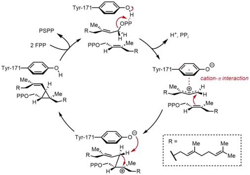 In the first half-reaction, two identical molecules of farnesyl pyrophosphate (FPP) are bound to squalene synthase (SQS) in a sequential manner. The FPP molecules bind to distinct regions of the enzyme, and with different binding affinities.[11] Starting at the top of the catalytic cycle below, the reaction begins with the ionization of FPP to generate an allylic carbocation. A tyrosine residue (Tyr-171) plays a critical role in this step by serving as a proton donor to facilitate abstraction of pyrophosphate. Moreover, the resulting phenolate anion can stabilize the resulting carbocation through cation-π interactions, which would be particularly strong due to the highly electron-rich nature of the phenolate anion. The allylic cation generated is then attacked by the olefin of a second molecule of FPP, affording a tertiary carbocation. The phenolate anion generated previously then serves as a base to abstract a proton from this adduct to form a cyclopropane product, presqualene pyrophosphate (PSPP). The PSPP created remains associated with SQS for the second reaction.[5][10] The importance of a tyrosine residue in this process was demonstrated by mutagenesis studies with rat SQS (rSQS),[7] and by the fact that Tyr-171 is conserved in all known SQSs (and PHSs).[2] In rSQS, Tyr-171 was converted to aromatic residues Phe and Trp, as well as hydroxyl-containing residue Ser. None of these mutants were able to convert FPP to PSPP or squalene, demonstrating that aromatic rings or alcohols alone are insufficient for converting FPP to PSPP.