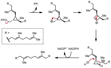 In the second half-reaction of SQS, presqualene pyrophosphate (PSPP) moves to a second reaction site within SQS. Keeping PSPP in the central channel of SQS is thought to protect the reactive intermediate from reacting with water.[5] From PSPP, squalene is formed by a series of carbocation rearrangements.[12][13] The process begins with ionization of pyrophosphate, giving a cyclopropylcarbinyl cation. The cation rearranges by a 1,2-migration of a cyclopropane C–C bond to the carbocation, forming the bond shown in blue to give a cyclobutyl carbocation. Subsequently, a second 1,2-migration occurs to form another cyclopropylcarbinyl cation, with the cation resting on a tertiary carbon. This resulting carbocation is then ring-opened by a hydride delivered by NADPH, giving squalene, which is then released by SQS into the membrane of the endoplasmic reticulum.[2]