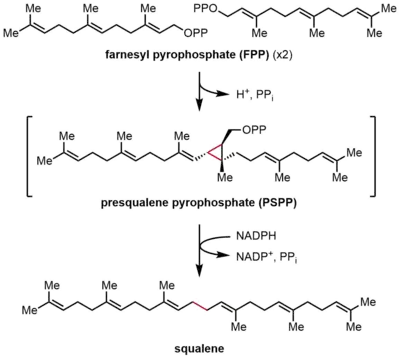 Squalene synthase (SQS) catalyzes the reductive dimerization of farnesyl pyrophosphate (FPP), in which two identical molecules of FPP are converted into one molecule of squalene. The reaction occurs in two steps, proceeding through the intermediate presqualene pyrophosphate (PSPP). FPP is a soluble allylic compound containing 15 carbon atoms (C15), whereas squalene is an insoluble, C30 isoprenoid.[2][4] This reaction is a head-to-head terpene synthesis, because the two FPP molecules are both joined at the C4 position and form a 1-1' linkage. This stands in contrast to the 1'-4 linkages that are much more common in isoprene biosynthesis than 4-4' linkages.[8][9] The reaction mechanism of SQS requires a divalent cation, often Mg2+, to facilitate binding of the pyrophosphate groups on FPP.[10]