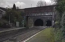 As part of the electrification scheme of the 2010s, the original tunnel has been enlarged to allow sufficient clearance for the overhead wires and for both lines to be routed through it once again.[7] During this period, the 1880 bore was initially retained to permit a limited diesel service over the route to continue during the upgrade work, and after was then abandoned as clearances within are too restricted to allow safe operation with overhead wires. This has also required realignment of the lines approaching it and consequent alterations to the platforms that they serve.[8] Work began in May 2015, when the 1838 bore was closed, filled in with cement and re-bored to a larger diameter using the largest tunnel boring machine ever built in Britain.[9] During tunnelling, the workers ran into loose/soft sand, which caused the project to be delayed from October to December and also led to the temporary closure of some lanes on the A666 road above for safety reasons.[10] The TBM finally bored through on 25 October 2015, 21 days after the scheduled completion date. The newly widened tunnel reopened on 14 December 2015, after a scheduled engineering possession on the preceding weekend to connect and test the track & signalling equipment.[11] The first train through was the 05:30 on 15 December from Horwich Parkway station, and the first passenger to use it was former councillor Andrew Morley.[12] At the end of January 2016, the tunnel was once again closed to enable replacement of the temporary tracks and their replacement[13] with tracks suitable for 100 mph running. Overhead wiring was later installed through the tunnel and electric trains were introduced along the route from Monday 11 February 2019, initially utilising Class 319 electric multiple units.[14]