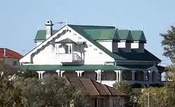 The building is almost square in plan, with verandahs on four sides, partially enclosed on the southern and western sides. The corrugated iron gabled roof is punctuated with three dormer windows each on the tapering northern and southern sides. The gable ends of the buildings feature narrow timber balconies, with hipped awnings, flanked by multi pane casement windows. Overhanging eaves and the decorative barge boards of the gables are supported on paired timber fretwork brackets. The single skinned external walls of the principal floor of the house are cross braced. Gable ends are clad with chamfered timber boards, and the underneath of the building is clad with tongue and grooved boarding.[1]