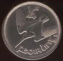 The farthing (1⁄4d) (Irish: feoirling) was the lowest value coin of the pre-decimal Irish pound, worth a quarter of a penny, 1⁄48 of a shilling or 1⁄960 of a pound. The coin had lost much of its value through inflation long before decimalisation in 1971, and during the 1960s no farthings were produced for general circulation; those minted in 1966 were produced for collectors' sets.