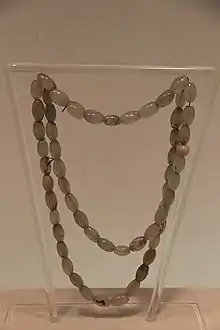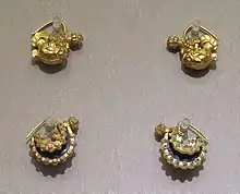 The inner garment of Khitan's man was a short garment or tunic worn under the round-collar gown.[9] They also wore trousers and high-topped boots which were either bordered or rolled at the top.[9] Khitan officials used gold ornamented ribbons to found their hair locks around their foreheads, covering their heads with felt hats according to the Ye Longli's Qidan Guozhi.[11] Khitan wore felt hats, fur clothes and woollen cloth and the Liao emperor switched between Han and Khitan clothing.[5]