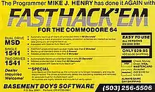 Fast Hack'em is a Commodore 64 fast disk/file copier, nibbler and disk editor written by Mike J. Henry and released in 1985. It was distributed in the U.S. and Canada via Henry's "Basement Boys Software", and in the U.K. via Datel Electronics. In the U.S., it retailed for $29.95 (equivalent to ~$100 in 2021).