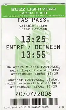The original FastPass system was still featured except Walt Disney World, which used FastPass+, along with both Shanghai Disneyland and Disneyland Paris, which replaced the FastPass system with a pay-for-use system called Disney Premier Access.[2] The system continued to use a virtual queue where guests are given a paper ticket with a designated time, instructing them when they would arrive at the head of the queue. However, each park had slight variations on the FastPass concept.