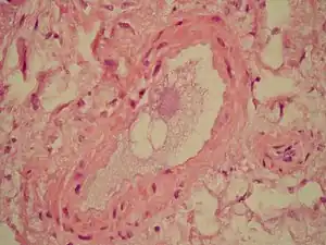 | Microscopic section of the lungs showing a blood vessel with fibrinoid material and an empty space indicative of the presence of lipid dissolved during the staining process. Haematoxylin and eosin stain | |