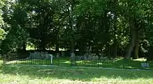 Samuel Wetherill, Jr. provided supplies to the Continental Army at Valley Forge, and was "read out of meeting" (disowned) by the Society of Friends in 1779, after refusing to renounce those actions.[28] Defying the pacifism of their religion, "Free Quakers" supported or fought in the Revolutionary War. Wetherill became a founder of Philadelphia's Free Quaker Meeting (chartered February 20, 1781),[28] and served as its clerk and preacher.[28] With brother-in-law Timothy Matlack, another charter member, he designed its meeting house (1783–84), at 5th and Arch Streets.[29] The meeting established its own burying ground, on the east side of 5th Street between Locust and Spruce Streets.[30] Membership dwindled as the Free Quakers died off, and their meeting house was closed in 1836.[29] As the turn of the 20th century approached, the Free Quaker Burying Ground plot became attractive for commercial development.[30] It was in anticipation of its sale that Col. John Macomb Wetherill (Samuel Wetherill, Jr.'s great-grandson) directed in his 1895 will that the private cemetery at Fatland be expanded.[30]
