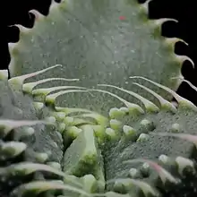 Faucaria tuberculosa, called warty tiger jaws, is a species of flowering plant in the genus Faucaria, native to southern Cape Provinces of South Africa.[2] A succulent, it has gained the Royal Horticultural Society's Award of Garden Merit.[3]