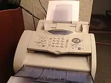 Fax (short for facsimile), sometimes called telecopying or telefax (the latter short for telefacsimile), is the telephonic transmission of scanned printed material (both text and images), normally to a telephone number connected to a printer or other output device. The original document is scanned with a fax machine (or a telecopier), which processes the contents (text or images) as a single fixed graphic image, converting it into a bitmap, and then transmitting it through the telephone system in the form of audio-frequency tones. The receiving fax machine interprets the tones and reconstructs the image, printing a paper copy.[1] Early systems used direct conversions of image darkness to audio tone in a continuous or analog manner. Since the 1980s, most machines transmit an audio-encoded digital representation of the page, using data compression to more quickly transmit areas that are all-white or all-black.