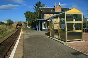 The railway through Fearn station is single track, the nearest passing loops being at Invergordon to the south and Tain to the west. The station has a single platform which is long enough for a seven-coach train.[8] The platform is very low and this gives rise to difficulties for passengers who are in any way infirm and unable to climb the height to the coaches, so there are portable steps available at the station. At the approach to Fearn station, conductors are obliged to use public address systems to warn alighting passengers of the low platform, and they also frequently do this when inspecting tickets of passengers travelling to Fearn.