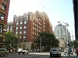 Interior public spaces are heavily ornamented with Art Deco materials and motifs. Access is gained through the First Avenue entrance into a vestibule with cast-bronze moldings and bronze-and-glass doors which lead to a public lobby and the post office. The public lobby floor is covered with dark red terra-cotta tile with cross strips and baseboards of Tokeen marble from Alaska. Walls are clad in light gray Wilkeson sandstone, and a coffered ceiling tops the space. Several original bronze, reverse-pyramid light fixtures remain in the lobby. A nearby elevator lobby has four elevators with original cast-bronze doors bearing floral Art Deco motifs.[2]