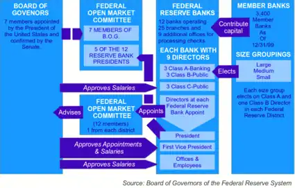 The Federal Reserve System has a "unique structure that is both public and private"[44] and is described as "independent within the government" rather than "independent of government".[24] The System does not require public funding, and derives its authority and purpose from the Federal Reserve Act, which was passed by Congress in 1913 and is subject to Congressional modification or repeal.[45] The four main components of the Federal Reserve System are (1) the board of governors, (2) the Federal Open Market Committee, (3) the twelve regional Federal Reserve Banks, and (4) the member banks throughout the country.