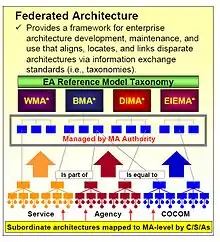Federated architecture (FA) is a pattern in enterprise architecture that allows interoperability and information sharing between semi-autonomous de-centrally organized lines of business (LOBs), information technology systems and applications.