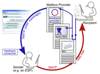 A feedback loop (FBL), sometimes called a complaint feedback loop, is an inter-organizational form of feedback by which a mailbox provider (MP) forwards the complaints originating from their users to the sender's organizations. MPs can receive users' complaints by placing report spam buttons on their webmail pages, or in their email client, or via help desks. The message sender's organization, often an email service provider, has to come to an agreement with each MP from which they want to collect users' complaints.[1]