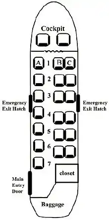Typical seat map of a smaller regional airliner as is often flown by the regional airlines. The smallest aircraft flown under such brands and regional airlines may or may not have lavatories.