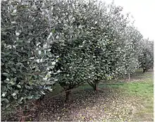 The fruit has been widely grown in New Zealand since the 1920s, and it has become a popular garden tree.[6] It is commonly available in season from March to June.[14][15] In New Zealand, the pollinators of this plant are bees, bumblebees, and medium-sized birds. The silvereye is a pollinator in the cooler parts of the South Island; the blackbird and the Indian myna, which feeds on the sweet, fleshy flower petals, are pollinators further north. In some areas where the species has been introduced, however, the trees have been unproductive due to lack of pollinators. The shrub has very few insect pests, although guava moth is a problem in Northland, New Zealand.[16]