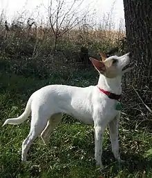 Some Mountain Feist bloodlines were indeed bred down from Jack Russell Terriers, crossing most likely with treeing dogs, such as Treeing Walker Hounds. Jack Russell traits often remain visible despite this crossbreeding. These descendants usually are mostly white in color with brown or black around the head and neck, with tall stand up, or button ears. These dogs usually hunt in packs in the Appalachian and Ozark Mountains. They use their eyes and ears exceptionally well.