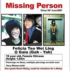Felicia Teo Wei Ling (23 February 1988 – 30 June 2007; 张玮凌 Zhāng Weǐlíng), was a Chinese Singaporean who was presumed dead after she went missing on 30 June 2007. She was alleged to be murdered by her two friends whom she visited on the same night. Teo was reported missing four days after she disappeared, and there were both search efforts and investigations made to trace her whereabouts. The case made headlines due to extensive public appeals and searches for Teo's whereabouts and became one of Singapore's high-profile missing person cases.[1]