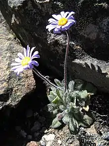 Felicia bellidioides is a perennial plant of up to about 25 cm (10 in) high, that is assigned to the family Asteraceae. Most of the narrowly inverted egg-shaped leaves are silky hairy and in a basal rosette with no or few very narrow bracts on the stalk in the subspecies bellidioides. In the subspecies foliosa, the narrower leaves are not silky hairy but variously bristly and glandular, with more and larger bracts on the inflorescence stalk. The flowerheads sit individually on top of a long peduncle and consist of an involucre with only two worls of bracts, about twenty purplish blue ray florets, surrounding many yellow disc florets. It occurs in the Western Cape province of South Africa.[2]