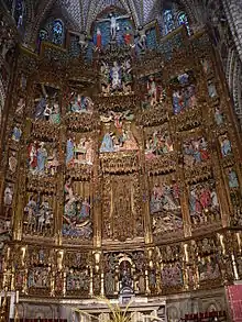 In 1499 Bigarny designed the basic structure of the main altarpiece of the Toledo Cathedral,[1] for which he was contracted by Cardinal Archbishop Francisco Jiménez de Cisneros.[2] He also prepared a figure of Saint Mark the Evangelist and agreed to sculpt several reliefs for the altarpiece, which he did between that time and 1504.[3] In those same years, he also made sculptures of Saints Augustine, Barbara, Gregory, Jerome, John the Baptist and of the Assumption for the altarpiece of the University of Salamanca. He next began plans for the chapel of the Sanctuary of the Palencia Cathedral, making it clear that although most of the work would be done by others in his studio, he personally would sculpt the faces and hands. On 12 December 1506, Bigarny delivered seventeen sculptures (among them a polychromed Saint Antoninus of Pamiers, the titular saint of the cathedral) and on 19 October 1509 he delivered the remaining nine figures. These were brought together on the main altarpiece of that cathedral. In 1509 he returned to Burgos to work with Andrés de Nájera on the choir stalls of the Burgos Cathedral, a project completed in 1512. The panels of the top row of side chairs are attributed to him and his workshop.