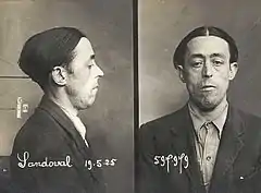 He was born in the poor former suburb of Las Injurias in Madrid. His mother had moved from Torrelaguna to the capital to escape hunger and she worked as a washerwoman in the Manzanares district. He did not know his father. Sandoval spent his childhood in an orphanage. In his youth, he worked as a bricklayer but also began his criminal career. In 1919, he was imprisoned in cárcel Modelo de Barcelona (Barcelona Model Prison) after committing a robbery. An unsuccessful escape attempt resulted in a severe beating on Christmas Eve which permanently disfigured his face. He was regarded variously by fellow prisoners as a man of no beliefs or ideas, a professional criminal or simply a killer or thug. He left Spain and settled in Paris, where from 1926 he would attend meetings of the anarchist Juan García Oliver, a founder of the armed group Los Solidarios which had been organized to counter oppressive practices by employers and government sectors against the unions in Barcelona; at these meetings he would find other anarchists who'd fled Spain. Los solidarios was also a precursor to the Federación Anarquista Ibérica (FAI) in Spain, which became allied to the Confederación Nacional del Trabajo (CNT), a grouping of anarcho-syndicalist trade unions.[1][2] [3][4]