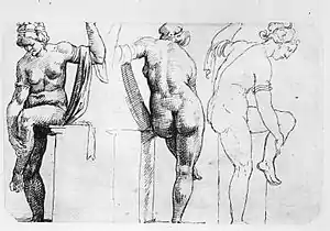 Avery suggests a now lost ancient Roman figure of a Bathing Venus as a possible source, one he identifies in a drawing showing three points of view, made by Maarten van Heemskerck during a visit to Rome around 1535. In this lost work, the figure stands on her right leg, and is largely supported by her left buttock which rests on a pedestal. Similar to Giambologna's figure, this woman also bends forward to clean her left leg.[12] Other sources might have been Raphael's Psyche being carried by Cupid (1517–18, Rome, Villa Farnesina) and Michelangelo's Ignudi (Rome, Vatican, Sistine Chapel, 1508–12).[13] A red wax model attributed to Giambologna (private collection), which is missing its limbs and head, and slumps backwards, is close in pose to the Getty-statue, especially in the left shoulder and angle of the neck.[14]