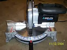 ![]() Table saw with a rip fence parallel to the blade, and a sliding crosscut fence perpendicular to the blade | |