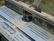 For crosscuts a sliding cross-cut fence or a mitre gauge – which incorporates a fence – is used. The workpiece is either held or clamped against the fence.[5]