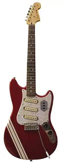 Introduced as the successor to the Cyclone in July 2002, the Cyclone II features changes such as the Mustang racing stripe as well as pickups and switching borrowed from the Jaguar. The guitar employs three pickups angled in a similar fashion to the Telecaster bridge pickup, rather than the standard two straight pickups of a Jaguar. It also features a Jazzmaster headstock similar to a 1970s Strat. It has vintage tuning heads as well as vintage nickel string saddles, which were found on 1950s model Strats. It was available in a choice of two colours, Candy Apple Red and Daphne Blue, both with the white racing stripe found on the Mustang.