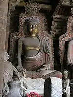 The main hall contains seven large sculptures of Buddhas from past ages, a rare arrangement in Buddhist temples.[8] The Buddhas are raised on an 87 cm high platform, with each of the seven inner bays holding one sculpture.[4] In addition to Sakyamuni (the Buddha of the present age), the six other Buddhas represented are Vipashyin, Sikhin, Visvabhu, Krakucchanda, Kanakamuni and Kashyapa.[8] Each of the seven Buddhas is flanked by two bodhisattvas, and a guardian king faces the south entry at each side of the altar. Behind the seven Buddhas, facing the back door, is a statue of Guanyin.[4][7]